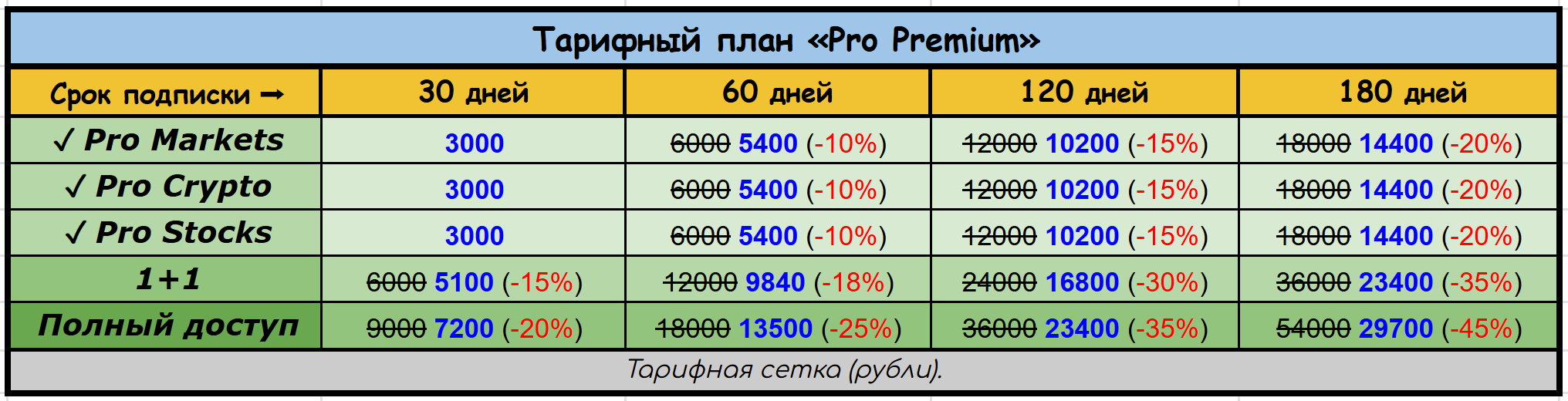 При подписке на три Pro-раздела (Crypto, Markets и Stocks) сроком на 120 дней — скидка 35%, 180 дней — 45%.